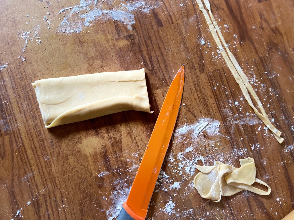 - Once the dough has been rolled out, fold it over itself several times and cut the roll of pasta to approximately ¼ inch. Dust with flour and repeat the process until all the dough has been cut.