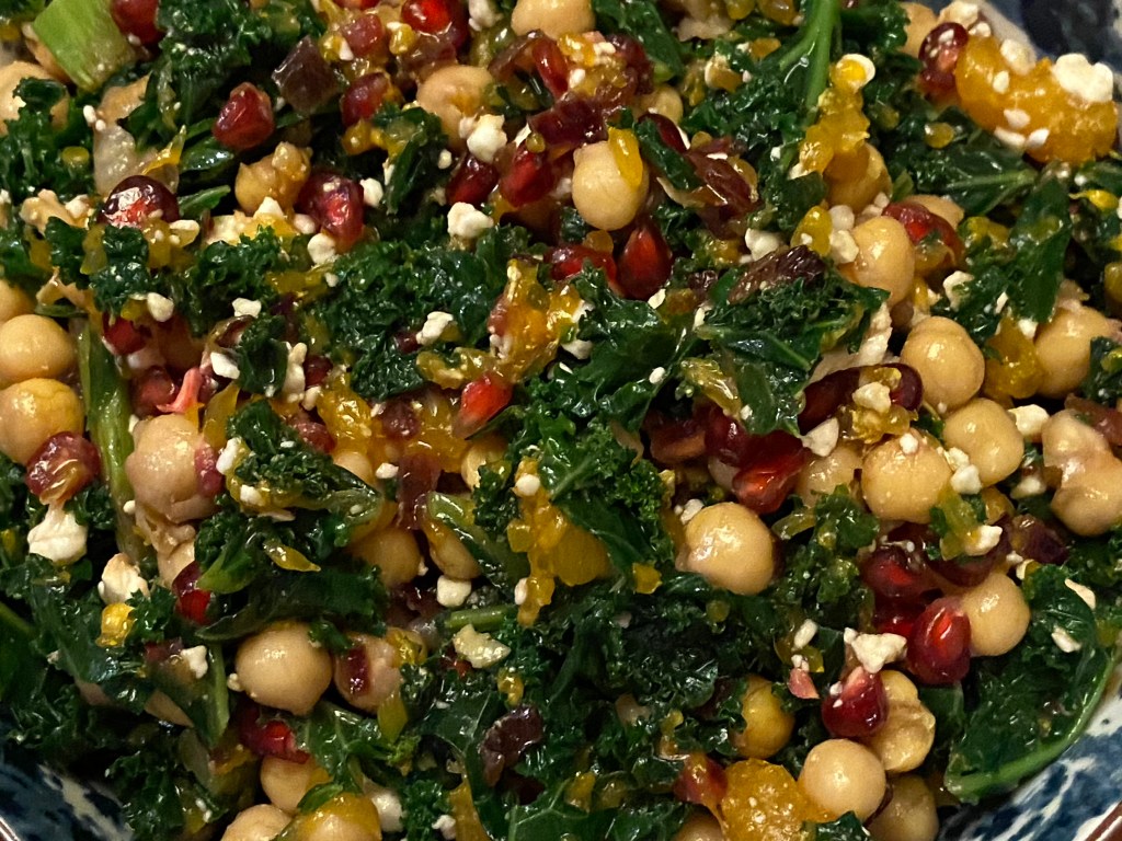 - Toss the chickpeas, mandarin segments, pomegranate, feta cheese into the kale, add dressing and mix well then serve. Enjoy!