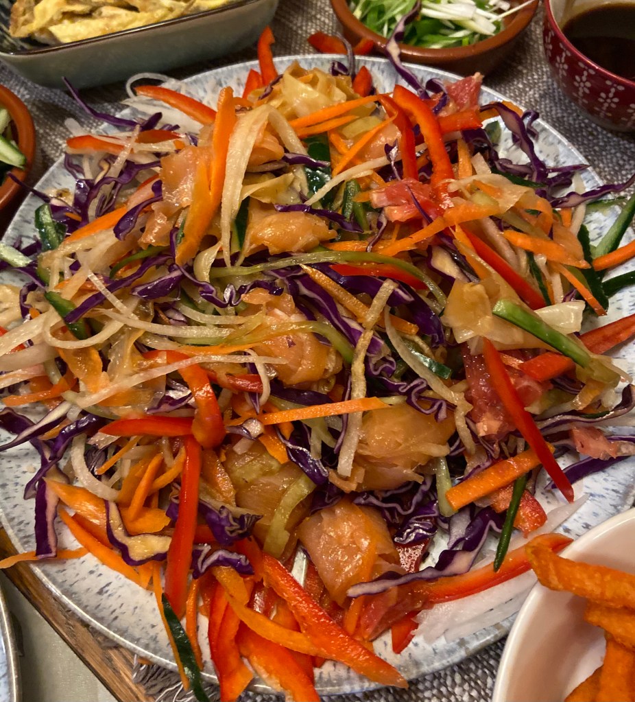 It is a raw fish salad topped with shredded vegetables and pickled *ingredients such as fried wonton strips, pomelo, carrot, daikon, red cabbage, cucumber, red peppers and usually smoked salmon. Laced with a plum sauce and five spice dressing plus a sprinkling of crushed peanuts. *ingredients vary but are usually cut into thin strips