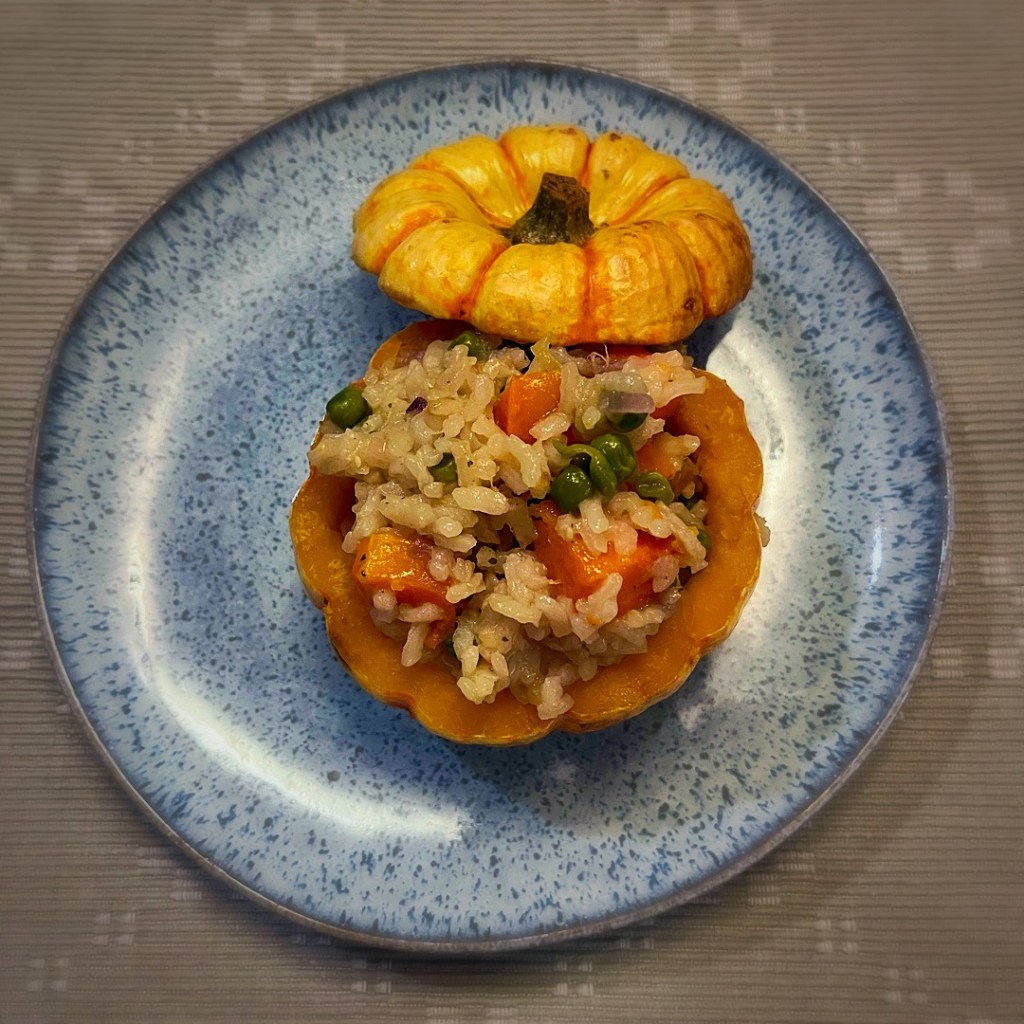 - Take the baked pumpkin out of the oven, add diced pumpkin to the cooked risotto and stir in the grated parmesan cheese. Serve in the baked pumpkin with a crisp dry white wine and enjoy.