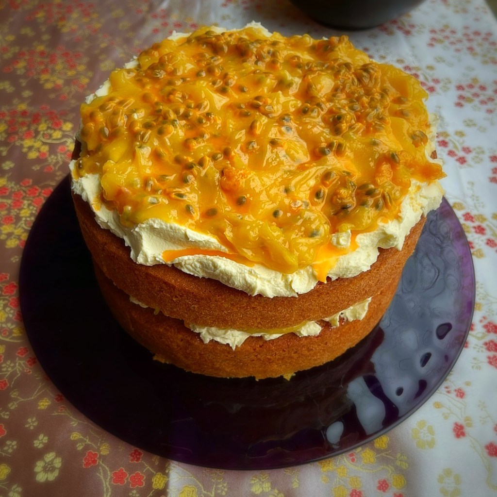 - Arrange one cake on serving plate and spread half of the mascarpone cream, two thirds of the curd and half the passion fruit pulp on top. Add second cake on top, spread remainder of mascarpone cream, curd and passion fruit pulp on top.